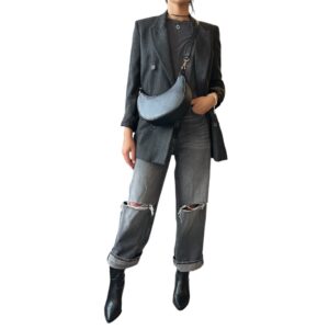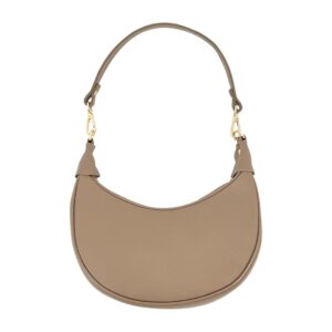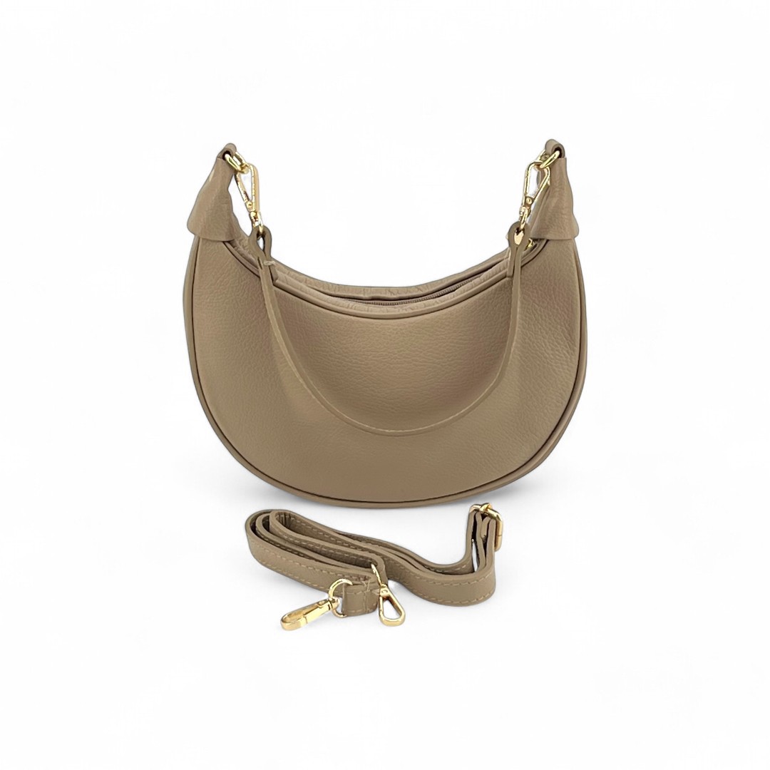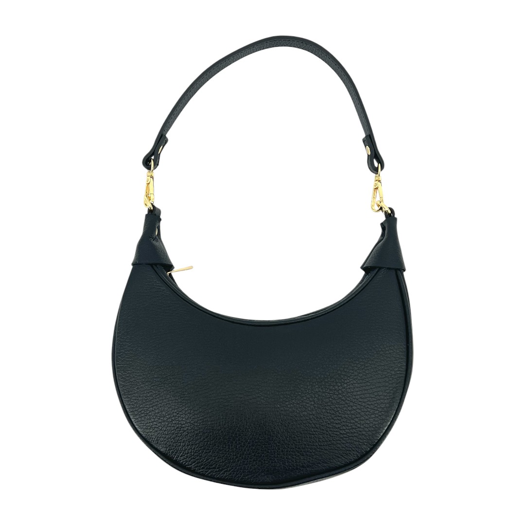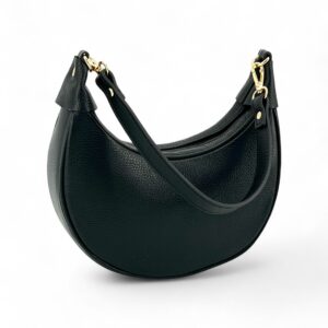 Sac en cuir grainé avec bandoulière ajustable, également en cuir.